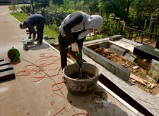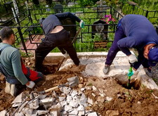 Приступаем к работе с цветниками. Один уже был в наличии, поэтому делаем второй, идентичный. По проекту цветники должны смотреться одинаково даже несмотря на то, что памятники будут разные. В это же время укладываем гранитную брусчатку уже на территорию места захоронения.