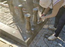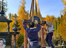 Начинается процесс монтажа. Доставляем памятники, крепим их, приклеиваем и насаживаем на штыри все конструктивные элементы надгробий.