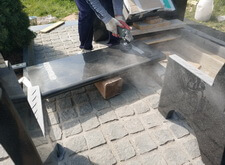 Проводим все те же действия на лицевой стороне памятника, на этот раз гравируем портрет умершего в кресле. Как и с ростовым изображением, лицо выбивается станком, остальное – ручная работа.