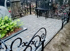 На представленных ниже фотографиях состояние места захоронения на момент прихода клиента. Брусчатка положена, форма цветника и вид оградки изменены. Работа над этим объектом – яркий пример того, как сильно может повлиять на внешний вид участка лишь одно наземное покрытие.